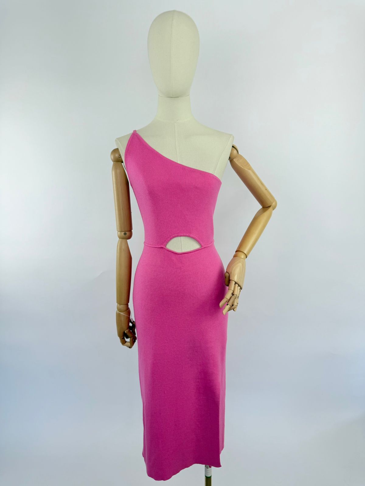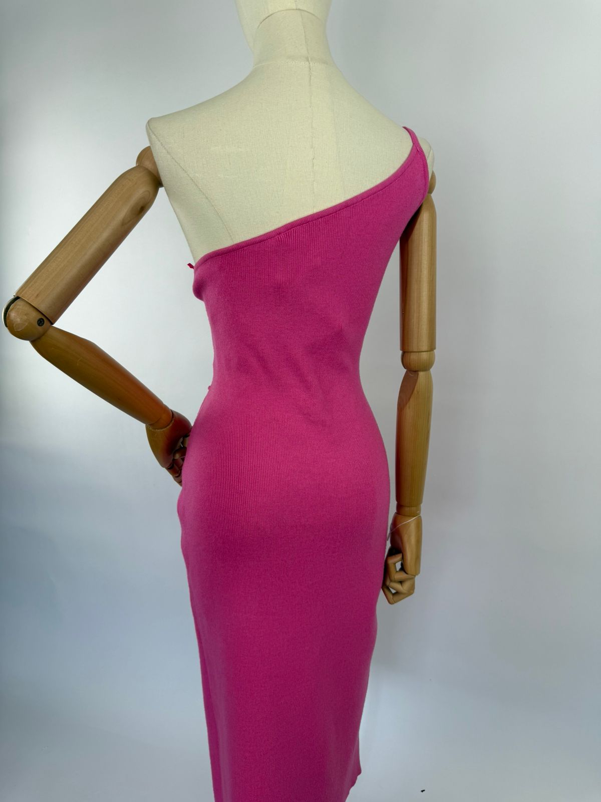 HERMOSO VESTIDO DE UNA MANGA CRUZADO COLOR FIUSHA CON UNA ABERTURA EN EL ABDOMEN