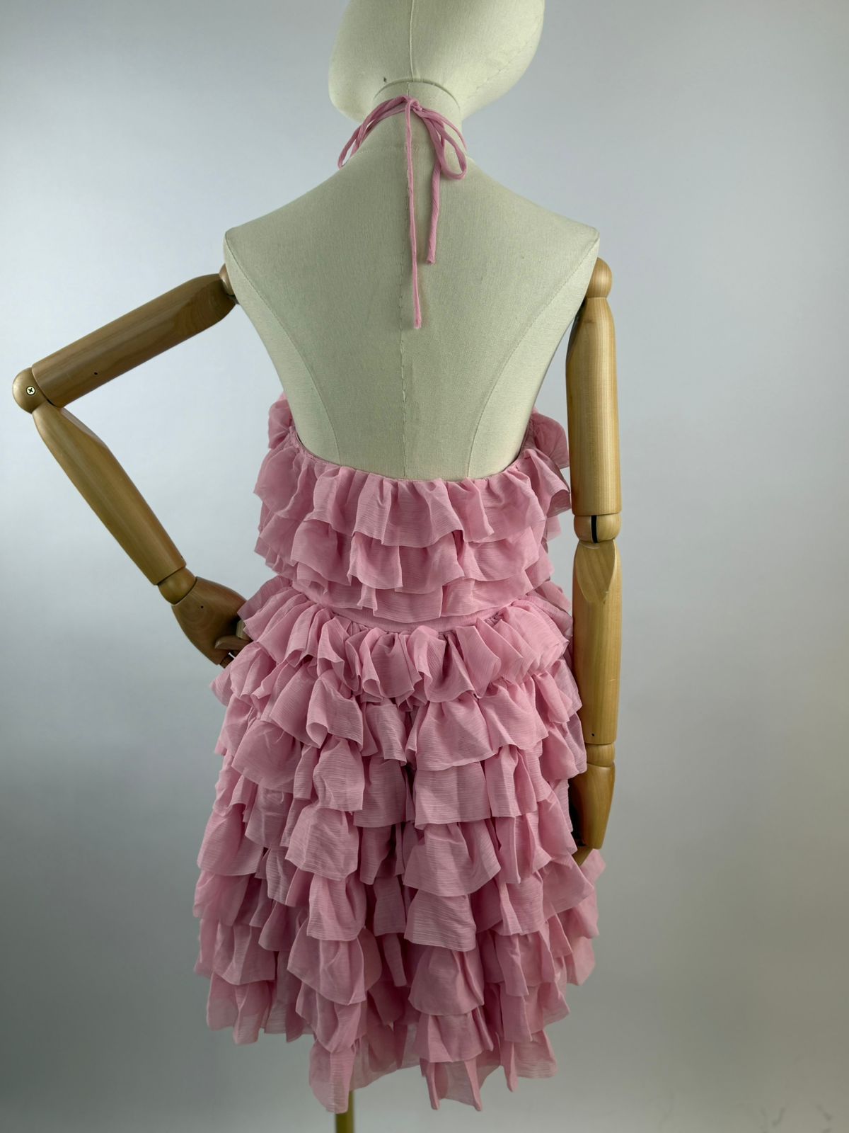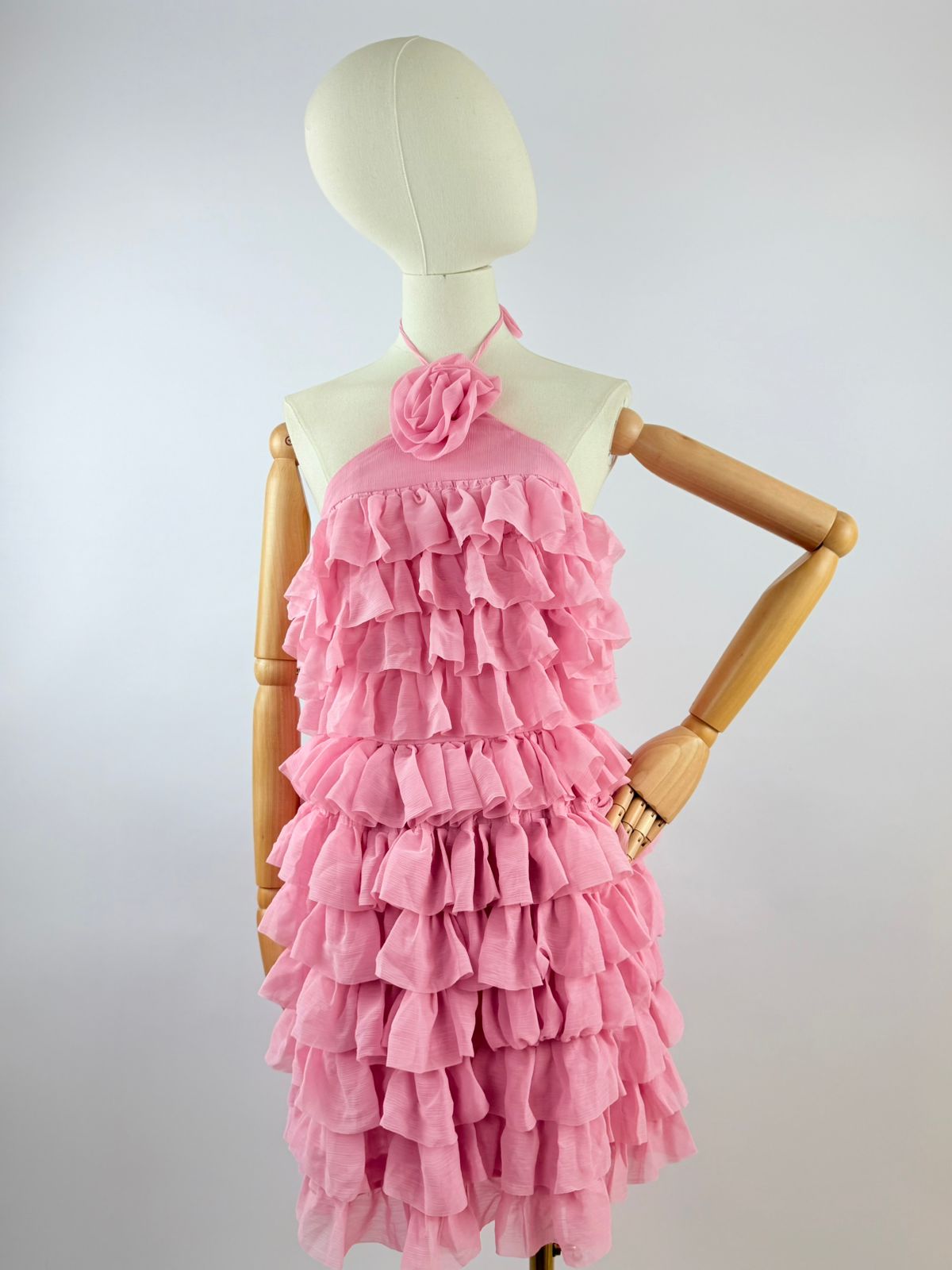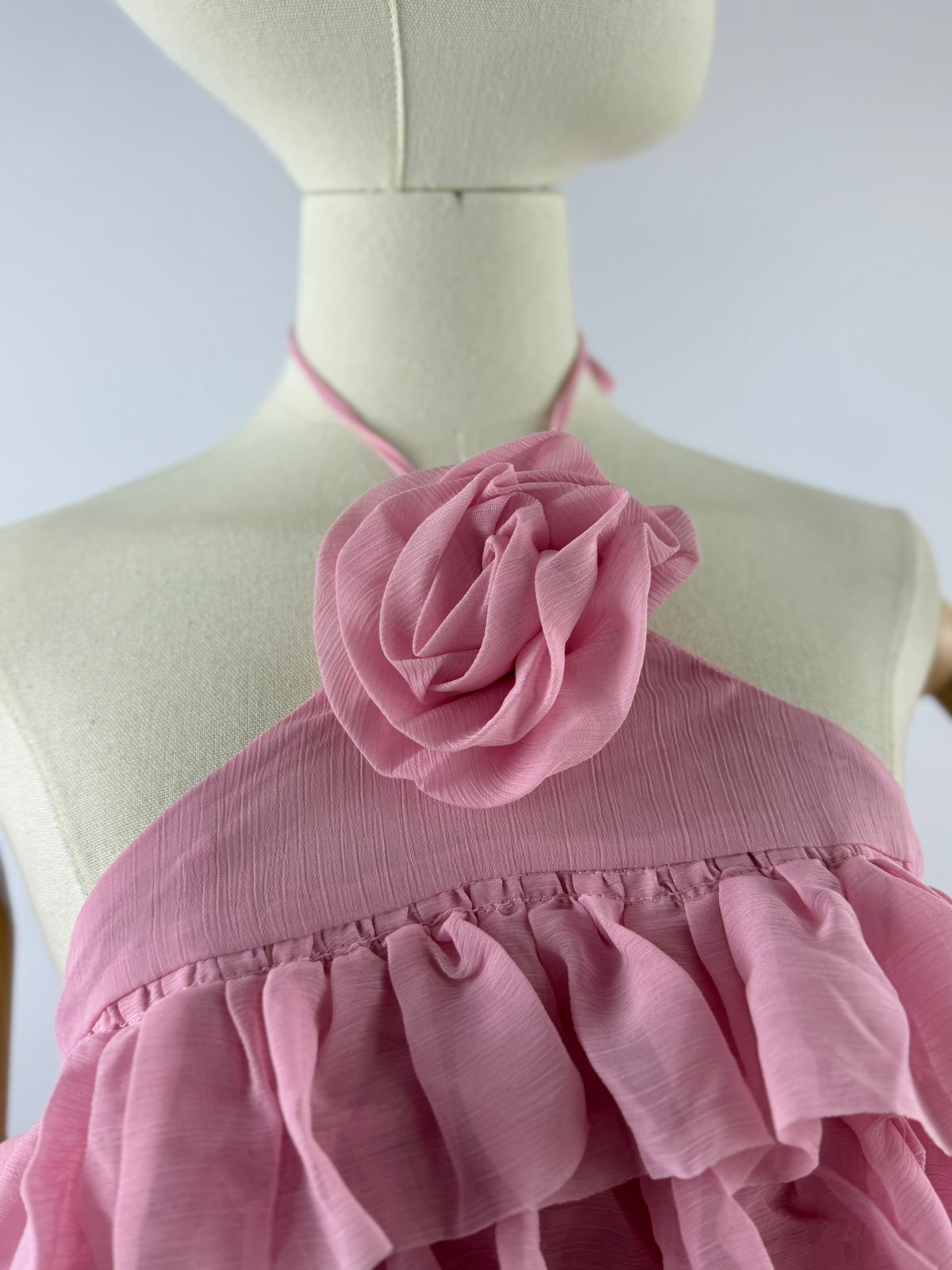 VESTIDO CORTO CON OLANES ROSA CON DE TALLE DE FLOR EN EL CUELLO